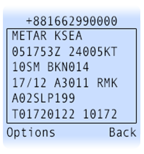Just type in your desired ICAO airport code and send. METAR and TAF reports are returned directly to your satellite device or its linked smartphone in just a few minutes